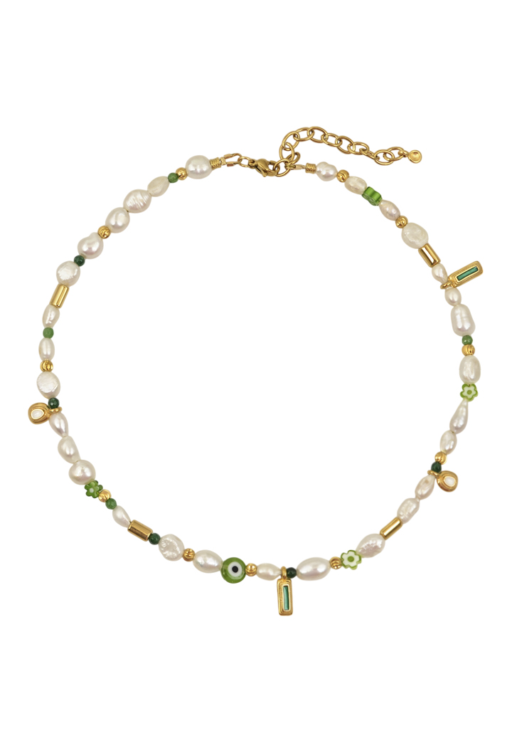 Κολιέ κατασκευασμένο από υψηλής ποιότητας μαργαριτάρια και ορειχάλκινα στοιχεία. Σχεδιασμένο για να προσφέρει κομψότητα συνδυάζει φυσικά στοιχεία με μοντέρνο σχεδιασμό, κάνοντάς το ιδανικό για κάθε περίσταση. Ανθεκτικός σχεδιασμός που διαρκεί.