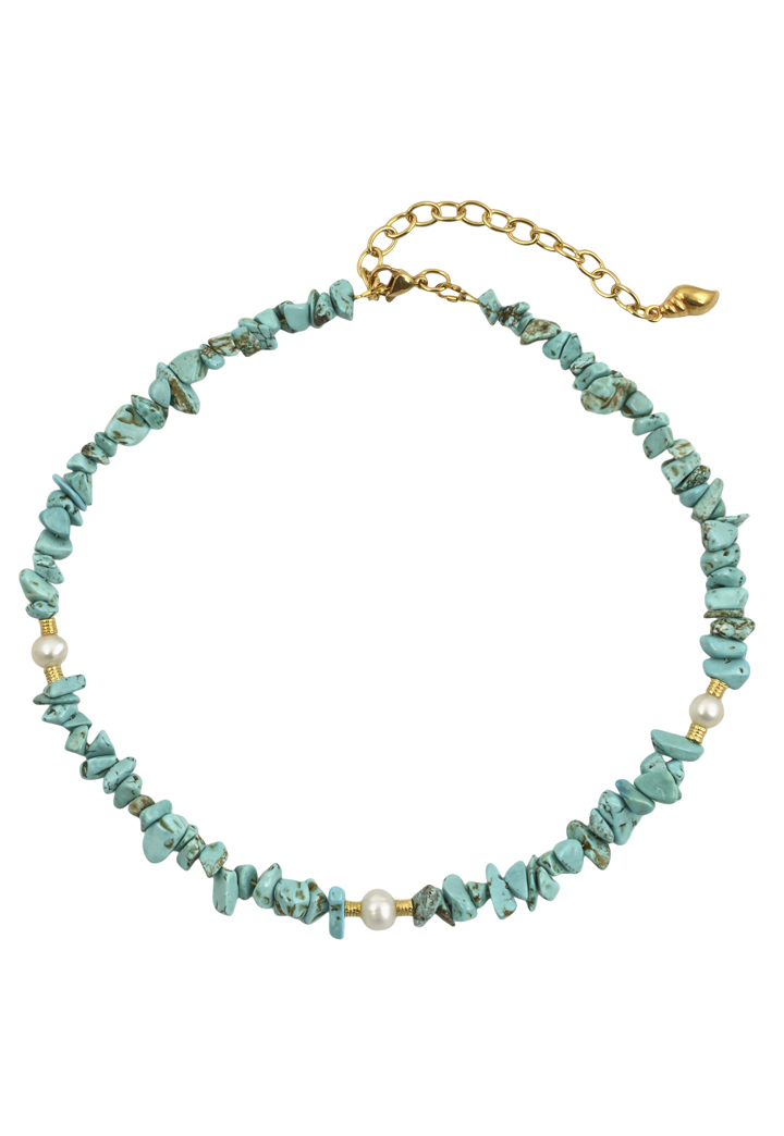 Κολιέ κατασκευασμένο από χαολίτη, μαργαριτάρια του γλυκού νερού και ατσάλινα στοιχεία. Σχεδιασμένο για να προσφέρει κομψότητα συνδυάζει φυσικά στοιχεία με μοντέρνο σχεδιασμό, κάνοντάς το ιδανικό για κάθε περίσταση. Ανθεκτικός σχεδιασμός που διαρκεί.