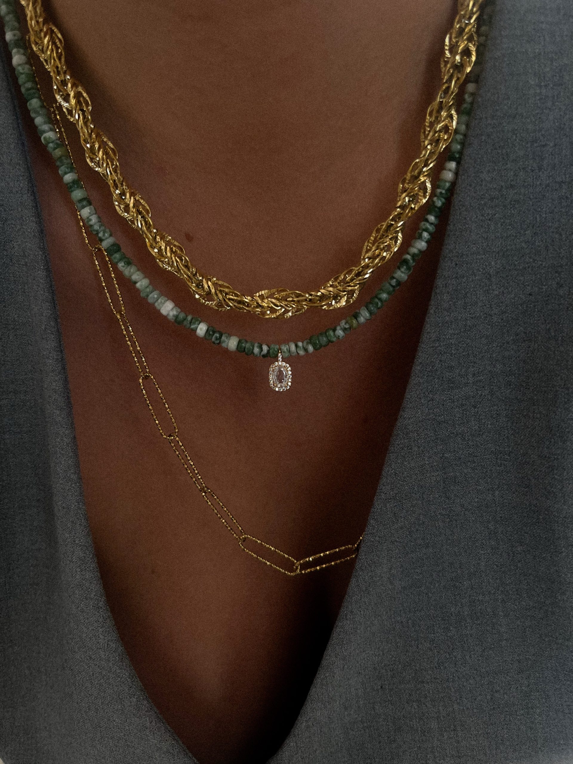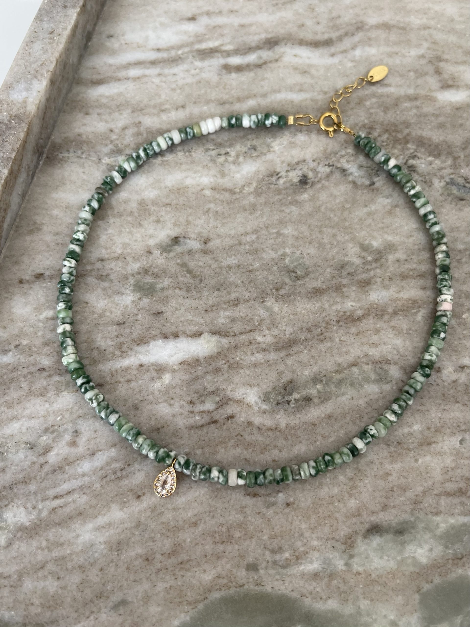 Κολιέ κατασκευασμένο από υψηλής ποιότητας ημιπολύτιμους λίθους και ατσάλινα στοιχεία. Σχεδιασμένο για να προσφέρει κομψότητα συνδυάζει φυσικά στοιχεία με μοντέρνο σχεδιασμό, κάνοντάς το ιδανικό για κάθε περίσταση. Ανθεκτικός σχεδιασμός που διαρκεί.