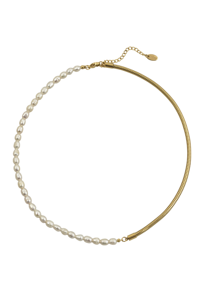 Κολιέ κατασκευασμένο από υψηλής ποιότητας ατσάλι και μαργαριτάρια του γλυκού νερού. Σχεδιασμένο για να προσφέρει κομψότητα συνδυάζει φυσικά στοιχεία με μοντέρνο σχεδιασμό, κάνοντάς το ιδανικό για κάθε περίσταση. Ανθεκτικός σχεδιασμός που διαρκεί.